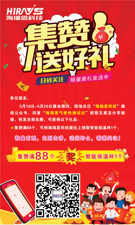在本次展會(huì)上,海瑞思科技除了給大家?guī)砹讼冗M(jìn)的氣密性防水檢測(cè)設(shè)備外,還準(zhǔn)備了驚喜的集贊送好禮活動(dòng)。在5月18日-5月20日展會(huì)期間,現(xiàn)場(chǎng)關(guān)注“海瑞思科技”微信公眾號(hào),回復(fù)“海瑞思?xì)饷苄詼y(cè)試儀”獲取文案及分享鏈接,轉(zhuǎn)發(fā)至朋友圈,可獲得以下禮品: